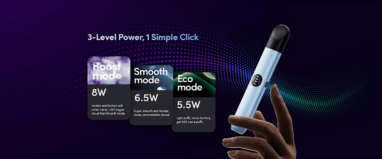 可調功率:Eco(5.5 W)、Smooth(6.5 W)、Boost(8.0 W)三段輸出,依吸阻偏好自由切換